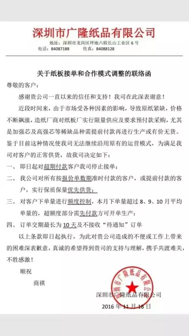 11月19号我不知道别的地方,我知道深圳的原材料紙張漲瘋瞭,一時間所有的包裝行業印刷行業朋友圈都在轉發,我開始憤怒瞭這是要逼著印刷廠都關門嗎?對你們有好處嗎原材料的廠商,你們不想讓我們接單瞭想讓我們斷糧食瞭,沒有紙的日子特别難熬,漫天飛的漲價聯絡單與限産單通知,沒有紙的日子特别難熬,爲什麽說紙價瘋漲也沒人管?並不是要故意制造恐慌,也不是要哄擡紙價。就幾天時間公司接到好幾張漲價的通知單,我說如果你告訴客戶他們肯定不願加他的價,這樣的話我們印刷廠就不好接單不好操作 ,你不可能一一的爲你的客戶去解釋吧,就算他們願意聽我們也沒那麽多時間,換個角度如果印刷廠集體罷工的話,那你們紙廠還有什麽資格是合夥漲價,本身今年明年印刷行業都是很困難的,這個雪上加霜的時候還漲價都不知道報的什麽心态。反正我是有圖有真相的等會有同行的可以看看,大家互相轉發抵制他們原材料漲價。深圳市博霖印刷感謝一路支持的客戶和供應商們特殊時候換位思考謝謝。