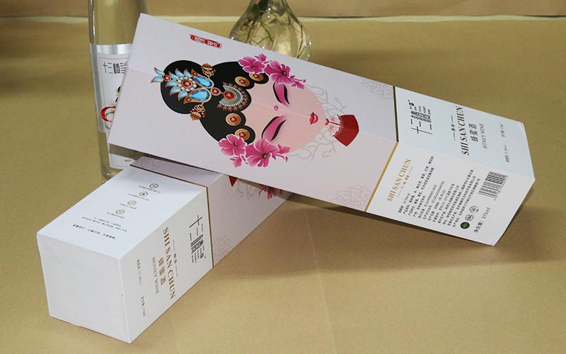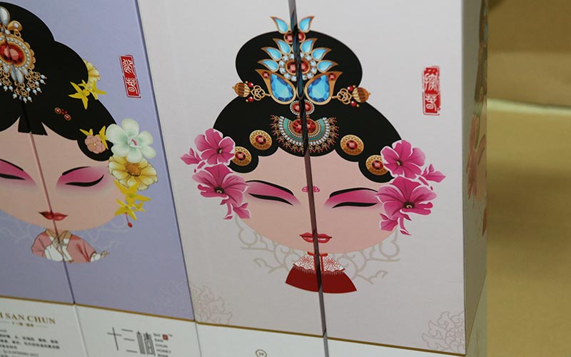 1.材質:盒子有兩個款式,兩款的材質也一樣 ,盒子面紙用157G銅版紙單面彩色印刷,盒子中間的人物局部UV光油,文字logo燙黃金和黑金 紅金三種色。盒子的上蓋結構最複雜,整款盒子都是純手工制作。