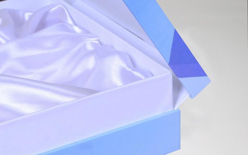 1.材質:盒子面紙採用銅版紙單面彩色印刷,啞膜,裱1300G單白闆,這款翻蓋盒中間加瞭内圍條,内圍條爲瞭更好地卡住盒子,内托用珍珠棉裱一層珍珠白綢布,整款盒子手工制作。