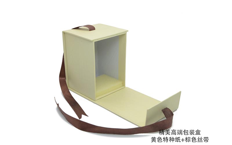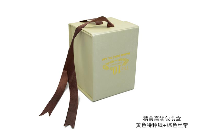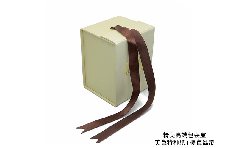1. 材質:盒子表面用米色珠光紙,表面LOGO文字燙金,裱1600G雙灰闆,盒型爲翻蓋(gài)盒盒子粘兩根絲帶(dài),整款盒子手工制作