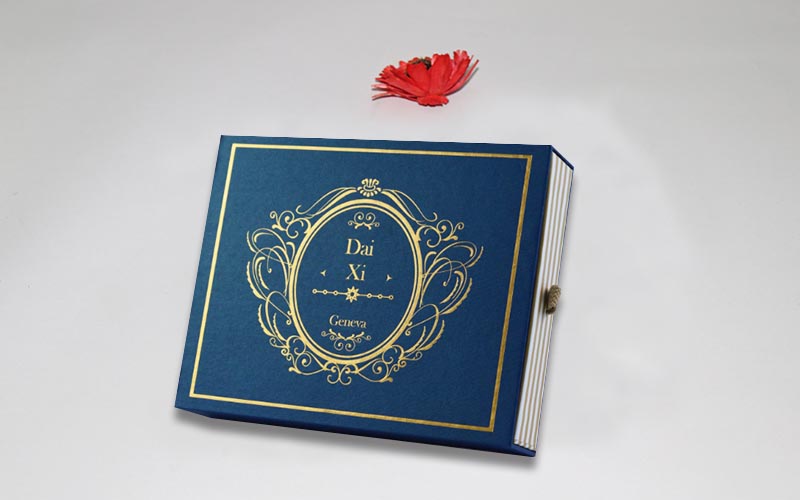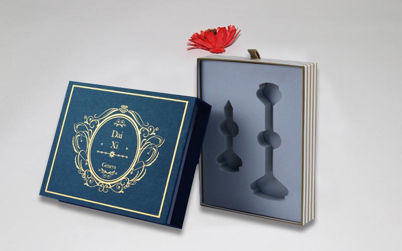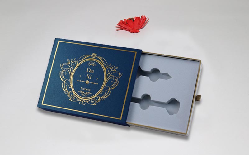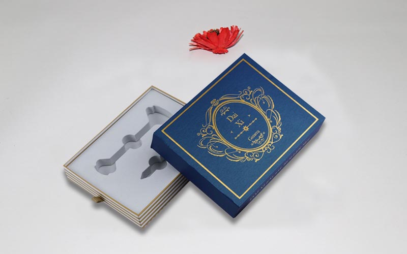 1.材質:外盒子用藍色珠光紋路的特種紙,盒子面紙文案燙黃金,裱1200G雙灰闆,抽盒157G銅版紙彩色印刷啞膜,裱1200G雙灰闆 ,内托用白色EVA開V槽固定産品。整款盒子機械化制作。