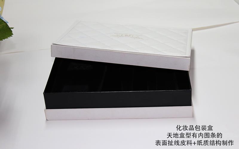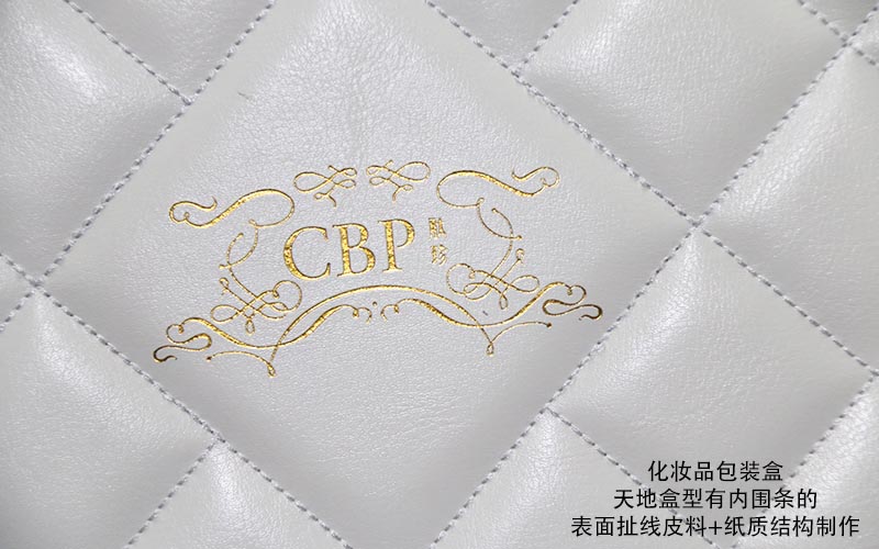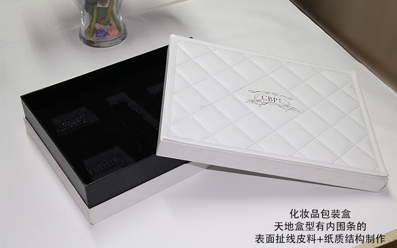 材質:天盒表面扯線白色皮質上面文字LOGO燙金,皮質半成品做好粘在天盒上面,整款盒子都用白色帶(dài)紋路的特種紙手工裱1600G雙灰闆,底盒的内圍條用黑卡紙裱1500G雙灰闆,盒子内部裝EVA植絨(róng)内托,手工制作