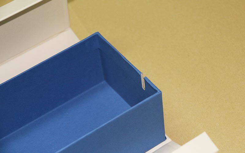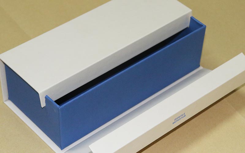 1.材質:外皮殼用米白色觸感特種紙,(特别有手感的一款紙)燙藍金LOGO,裱1500G立格灰闆,内盒同樣用藍色特種紙裱1500G雙灰闆 ,内盒左右兩邊開兩個槽位,盒子翻開的地方更好的卡進去,不留縫隙,手工制作 。
